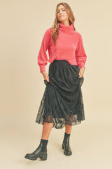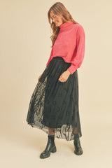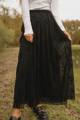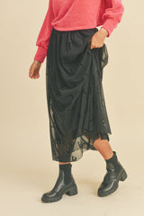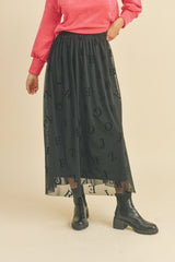 Such a fun and cool design, this lettered skirt has a delicate mesh overlay, pair this piece with a black sleeveless crop top and block heels for that effortless cool girl vibe.