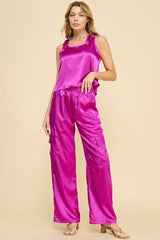 Such a cute and fun option for those hotter days! This tank top has a relaxed fit a cute knot detail on the shoulders! You can even wear it to work if you throw on a blazer on top. You can also style it with some denim shorts or Satin Cargo Pants.
