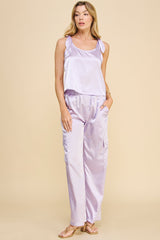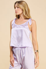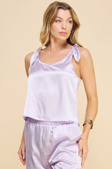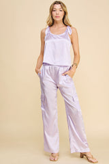 Such a cute and fun option for those hotter days! This tank top has a relaxed fit a cute knot detail on the shoulders! You can even wear it to work if you throw on a blazer on top. You can also style it with some denim shorts or Satin Cargo Pants.