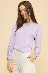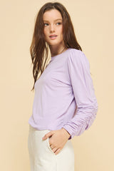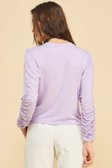 Stylish monotone blouse with tastefully designed ruched sleeves. Complement this top with a brightly printed palazzo pant or satin skirt for a sophisticated and put-together look.